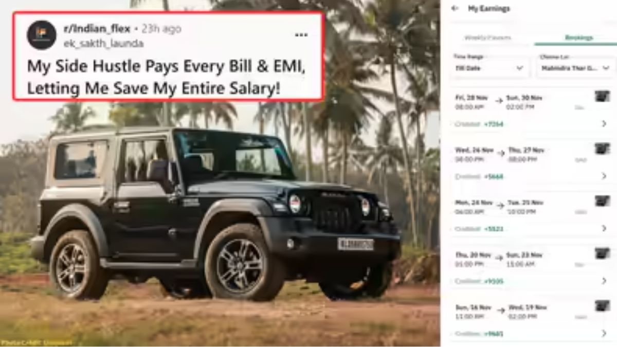 युवक ने बताया कि उसकी कॉर्पोरेट जॉब अच्छी है और सैलरी भी मजबूत है, लेकिन महंगाई के दौर में EMI और बिल देने के बाद बचत कम हो रही थी। जब उसने Thar खरीदी तो शुरुआत में EMI का दबाव महसूस हुआ, लेकिन कुछ महीनों बाद उसने SUV को रेंट पर देना शुरू कर दिया। धीरे-धीरे इस मॉडल ने उसकी पूरी आर्थिक तस्वीर बदल दी। अब उसकी Thar की रेंटल आय ही उसकी पूरी महीने की जरूरतें पूरा कर देती है। कार की सर्विस, फ्यूल और मेंटेनेंस भी इसी इनकम से मैनेज हो जाते हैं। वह कहता है कि नौकरी की सैलरी वह छूता भी नहीं, क्योंकि हर महीने यह पूरी की पूरी सेविंग अकाउंट में चली जाती है। उसके दोस्तों का कहना है कि यह आइडिया युवाओं के लिए बड़ा सीख देने वाला है कि साइड इनकम लाइफ को कितना आसान बना सकती है।